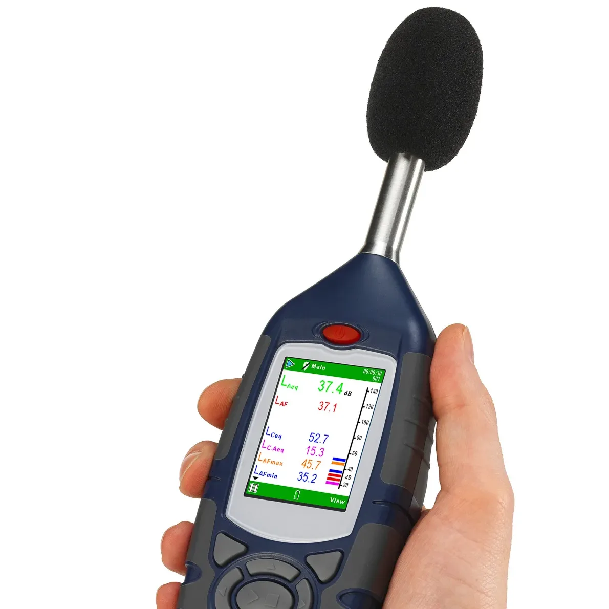 real-time and stored in selectable 1s to 30min intervals, so a user can see how the noise level varies with time.
