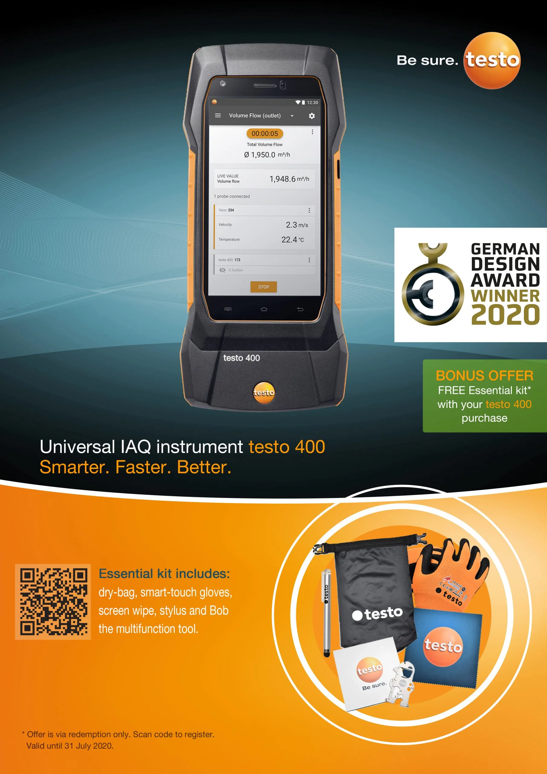 The Testo 400 – Universal IAQ instrument is the universal measuring instrument for all IAQ professionals. Measure, analyze and document all IAQ and comfort level parameters using just one instrument – simply, conveniently and in compliance with the standards. High-quality measuring technology, intuitive measurement assistants, versatile documentation options and a comprehensive selection of IAQ probes make the Testo 400 the perfect partner for your day-to-day work.